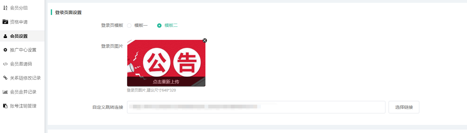 登录页模板二:可上传登录页图片和自定义跳转链接,H5使用手机号码登录时点击图片可以跳转到指定跳转链接页