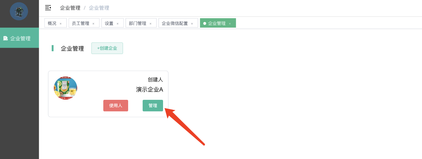 在企业管理界面点击具体的企业--管理,进入企业管理: